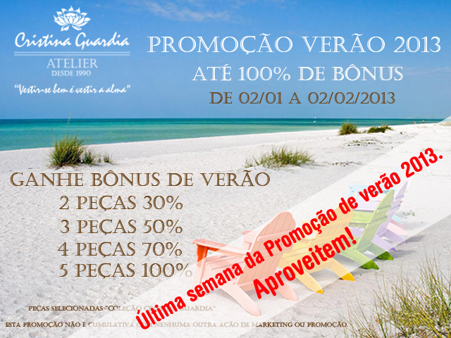 Termina no dia 02 de fevereiro a nossa Promoção de Verão 2013 Cristina Guardia. Não percam essa oportunidade.